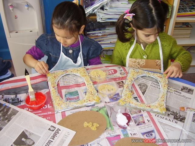 Sınıfımıza, " ahşap boyama kursuna" giden velilerimizi davet ettik, fikir onlardan çıktı, aile katılımı olarak bize ahşap boyamayı öğrettiler. Çok kolaymış!!!!!... Önce çerçevelere beyaz tutkal sürüldü, sonra üzerine tel-arpa-yıldız- çeşitli makarnalar, kırılan saç tokaları gibi malzemeler serpiştirildi, istenilen renklere boyandı kuruyunca pullar- payetler boncuklar ve simler eklendi ve sonra verniklendi. Zahmetli ama eğlenceli bir çalışma oldu. Velilerimin ve minik öğrencilerimin minik ellerine sağlık.. Teşekkürler...
