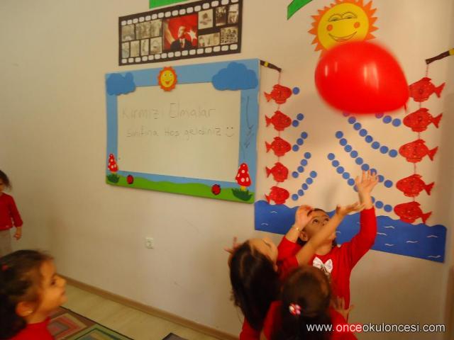 Kırmızı balonlarla oynadığımız oyun. Kızlar ve erkekler grup olarak ayrıldı. Tek elle oynanıyor, bir el belin arkasında ( Bunu uygulamak zor oldu, balonu düşürmemek için iki elle müdahale etti bazıları ). Balonun yere düşmemesi gerekiyor. Düşünce grup değişiyor.