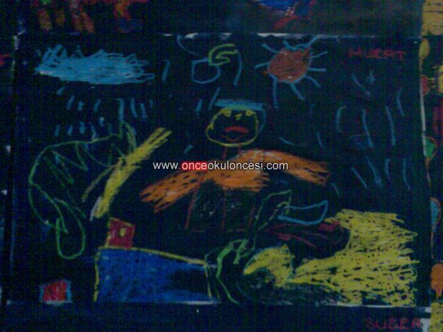 İlk önce pastel boya ile beyaz kağıda resim yapılr.Daha sonra kağıt, mürekkep ile tamamen boyanır... Çocuklar bu çalışmadan çok keyif alıyorlar. Tavsiye ederim