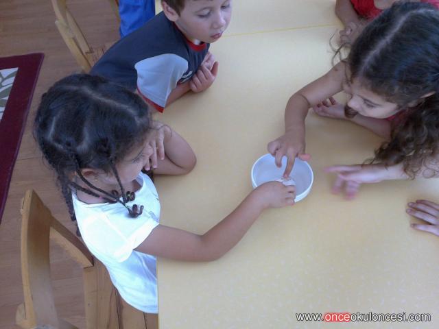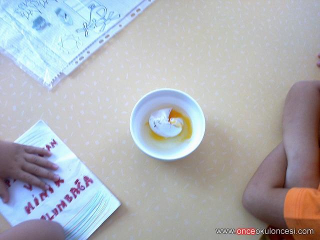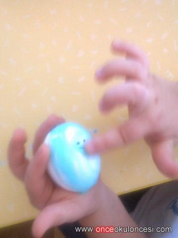 yumurtamızın bir tarafına gülen yüz diğer tarafına üzgün yüz çizdik ve gülen yüz tarafını günde 2 defa fırçaladık diğer tarafı fırçalamadık 3 gün kadar yaptık bunu sonra bir günden sirkeli suda beklettik sonuç böyle oldu en sonunda yumuşak kısım çocuklar tarafından patlatıldı