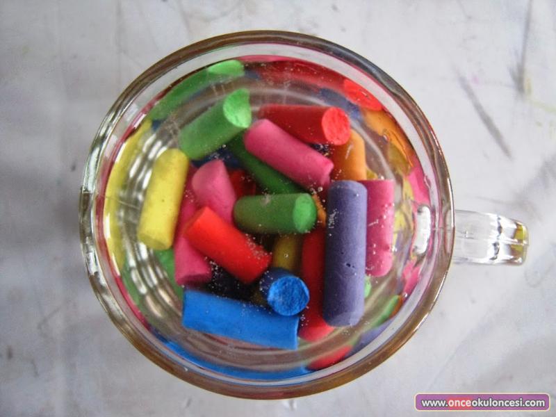 DENEYİN AŞAMALARI; 1. Gerekli malzemeler; bardak dolusu su, şeker, tebeşir 2. tebeşirler şekerli suya atılır. 3. masada 2 saat dinlenmeye bırakılır. 4. tebeşirler kağıt havluya alınır ve kurutulur. kaynak : miniminiyiz