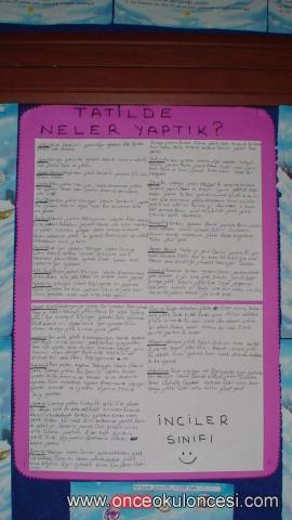 Öncelikle "tatilde neler yaptın?" yönergesi ile çocukların anlattıkları tek tek not edilir.( Türkçe dil etkinliği )
