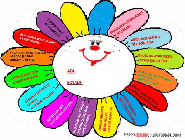 bu çiçeği çocuklarada boyatabilirsiniz yada siz renkli hazırlaybilirsiniz.çiçeğin her yaprağında bir kural yazıyor ve çocuklarla bu kuralları konuştuktan sonra bir süre takip edersiniz kurallara uymayan çocukların hangi kurala uymuyor ise yaprağını kesersiniz ve belirlediğiniz süre sonunda en çok yaprağa sahip olan çocuğu ödüllendirirsiniz ve bunu en başında çocuklara açıklarsanız kuralları kazanmada çok etkili oluyor.ilginize...