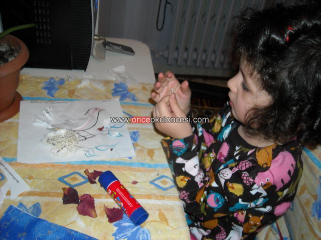 NEHİR (33 AYLIKKEN ) , KUŞ VE YUMURTALARININ RESMİNİ KOLAJ TEKNİĞİ İLE YAPARKEN
