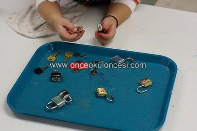 Eşleştirme deyince nedense aklımıza hep kağıt eşleştirme oyunları geliyor. Oysa daha geniş bakmak lazım bu konuya... Bu etkinlikte bu açıdan düşünüldüğünde çok yararli bir çalışma olabilir. Çocuklar kilitlere uygun olan doğru anahtarları bulmaya çalışıyorlar. (Küçük yaş için biraz kompleks olabilir. Bu yüzden anahtar ve kilitlerin sayılarını azaltmakta fayda var.)