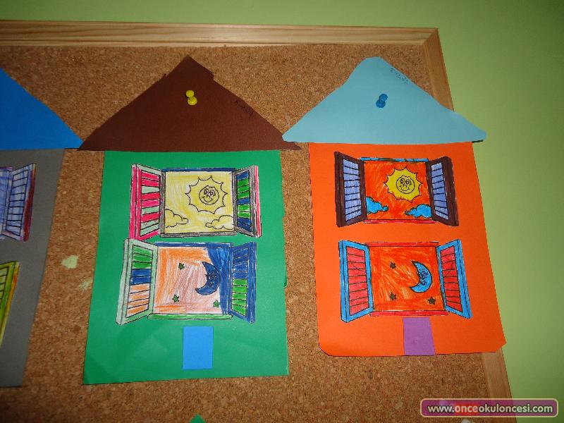 Önce dikdörtgen ve üçgenlerini kestiler evlerini oluşturdular. Sonra pencereler boyandı ve yapıştırıldı.