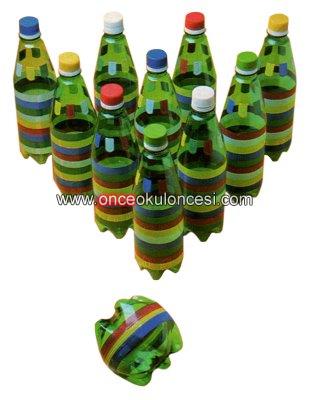 Hazırlanış bakımından oldukça basit bir etkinlik.Şişeler resimdeki gibi hazırlanacağı gibi her bir şişede rakam,renk,geometrik şekil de kullanabiliriz.Bowling topu iki şişenin alt kısımları kesilip bantlayarak hazırlanır. alıntı..