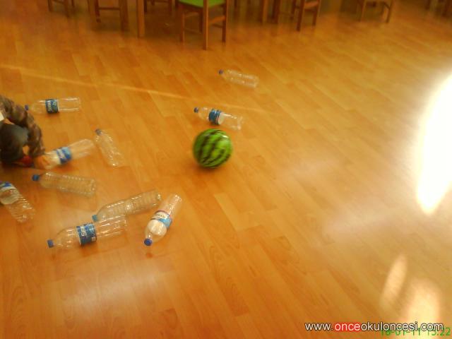 bu oyunla bir çok kavramı bir arada verdim. BOŞ-DOLU KAVRAMI, SAYI KAVRAMI, RENK KAVRAMI, TEK-ÇİFT KAVRAMI, AZ-ÇOK. şişelerin arasında dolandık,tek ayak ve çift ayakla üzerinden zıpladık,saydık. ardından da hedefe vurmaca,yaniiii bowling oynadık bowling zamanııııııı
