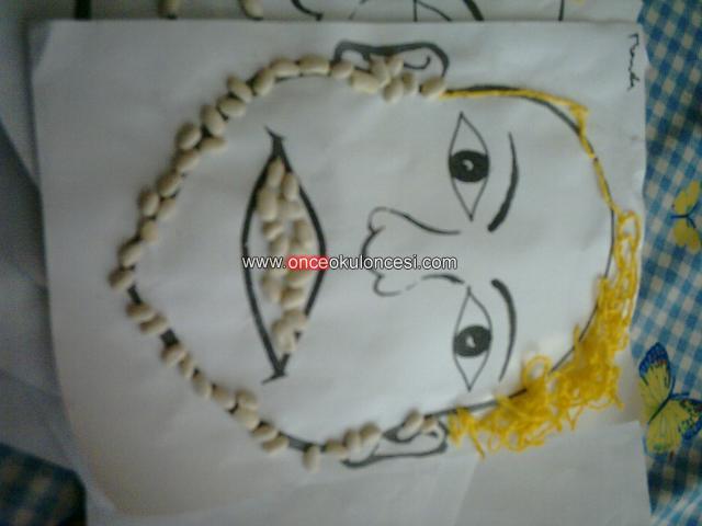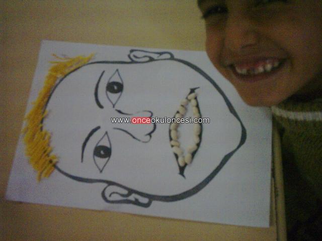 fasulyelerden dişler iplerden de saçlar yapmak istemiştik. ama bazı yaratıcı çocuklar fazla fasülyelerden sakal bile yaptılar
