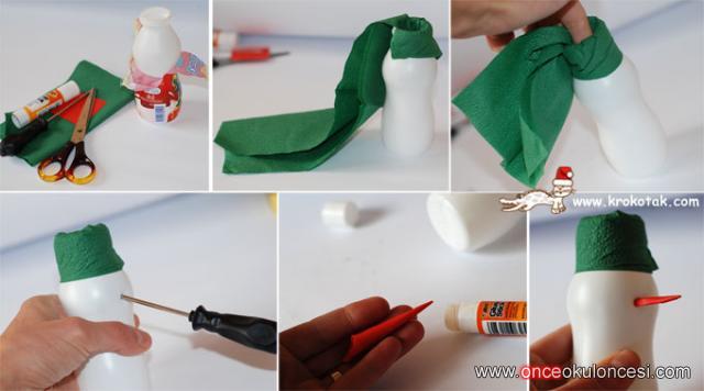 Ben bunu uygulamadım begendım ve paylastım sadece ama sanırım baska şişelerden de olur mesela kucuk fanta sıselerı de uygundur bence cunku onunda ortada bogumu var.. o bogum govde ıle kafayı ayırıyormus gıbı hoc bır goruntu yakalıyor. sanat etkşnliği ya da kar ile ilgili bir hikayeden sonra hıkaye sonrası etkınlık olarak alınabılır bence.. cocugun atkısını baglayabılmesı ya da sapkasını şişenin içine sokabilmesi (burun deliğini bizim yapmamız şartı ile) burnuna fon kartonnundan havuc gıbı yuvarlayarak o deliye yerleştırebılmesı gıbı kucuk kas becerilerini kazandırmak amac olabılır. daha sonra butun kardan adamlar uzun ıplerle ayrı bır yere baglanabılır(cocuklar tarafından) mobil yapılabilir.. uzerınde kendımız eklemeler yapabılırız... ornegın ufak cam agacı yapraklarından supurge yapabılırler... elinde tutuyormus gıbı bantlayabılırler yanı gelıstırmesı , özgun urunlere ulasmak tamamen sizin elinizde..