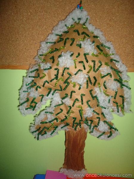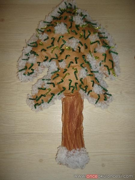 Kraft kağıdından arkalı önlü iki kalıp çıkarıldı ve çam ağacımızın içini elyafla doldurdu çocuklar. Kış mevsiminin yaprağını dökmeyen bu kıymetli ağacımızın yaprakları da şönillerden yapıldı. Doğal süsü olan kar ile süslendi.