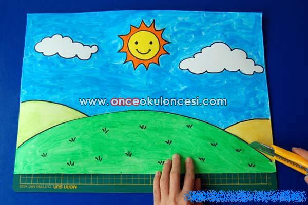 Resim çizilir ve boyanır. Yeşil kısım maket bıçağıyla kesilir. Çeşitli taşıt kuklaları hazırlanır ve kırlarda gezintiye çıkarılır![]()