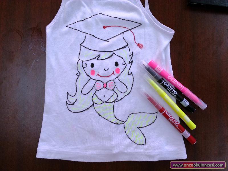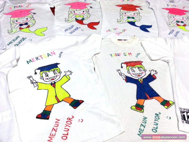Hem de nasılAslında ilk fikrim, beyaz tişört üzerine çocuklara özgün şekilde resim çizdirmek, boyatmaktı. Bu yüzden kalem boya tercih ettim. Ama mezuniyet söz konusu olunca böyle kepli bir figür olsun istedim, onu da kendim çizmem gerekiyordu, ben çizerim çocuklar boyar derken baktım boyamak da kolay olmayacak onlar için. Tümünü çocuklara yaptıracağım derken tümü bana kaldı