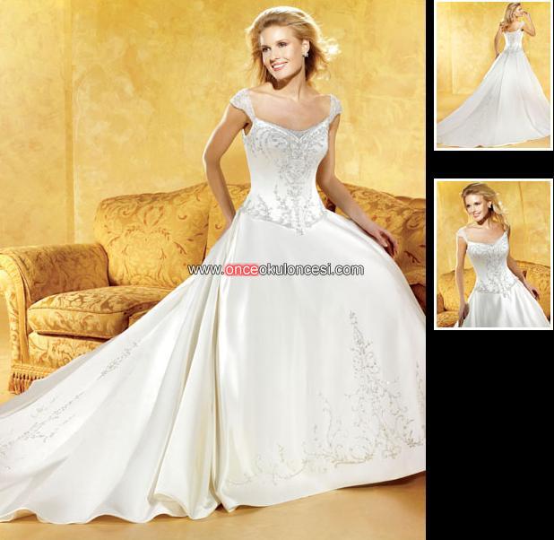 benim gelinliğim kırık beyaz, kayık yakaydı, iki paçalıydı. alt kısmı fazla kabarık sevmediğim için tek kat saten ve üstüne iki kat önden işlemeli tülü vardı