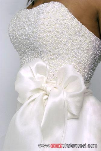 İncilerle süslü bir gelinlik olacak öyleyse etek kısımlarında da inciler azalarak inebilir altında da tüller dikkat çeker