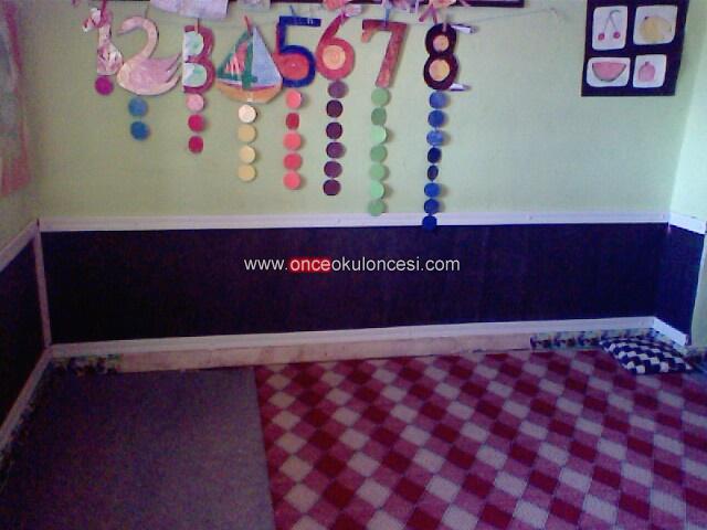 Sınıfımda yukarda gördüğünüz girinti var. Orada dolabımız, malzemelerimiz, oyuncaklarımız, çöp kutusu vs. var. Masa ve sandalyeleri yan odaya taşıyoruz, gerektiğinde kuruyoruz.