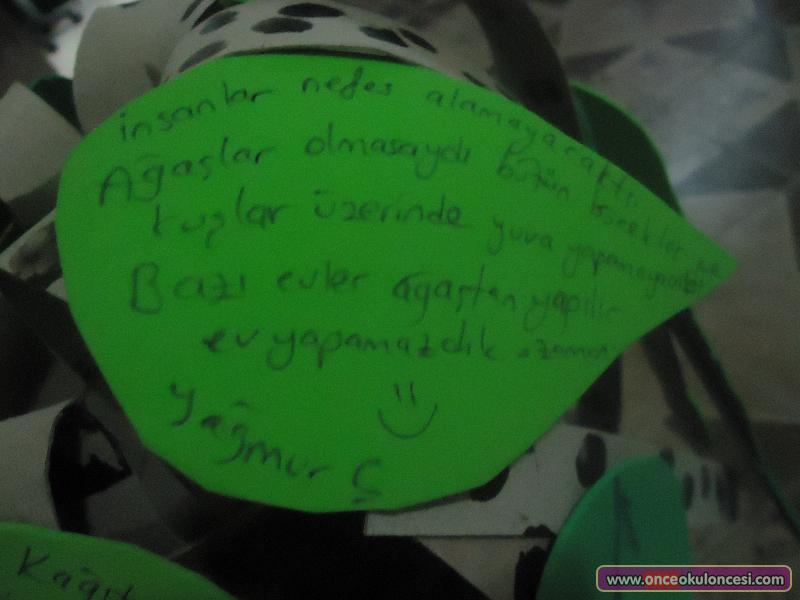 Ağacın gövdesi mukavvadan yapıldı rolo haline getirilerek. Dalları için de mukavvadan şeritler kesildi. Yapraklarını evadan kestiler.