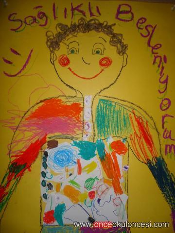 Sağlıklı besinler nelerdir konuştuk. Her çocuk bu besinleri kağıdına çizdi ve çizdiklerini kestiler. Çizilen çocuk kalıbımızın karnı açmış ve yüzü solgun dedik. Sağlıklı besinler yapıştırıldı ve en son çocuğumuzun yanakları kızardı.