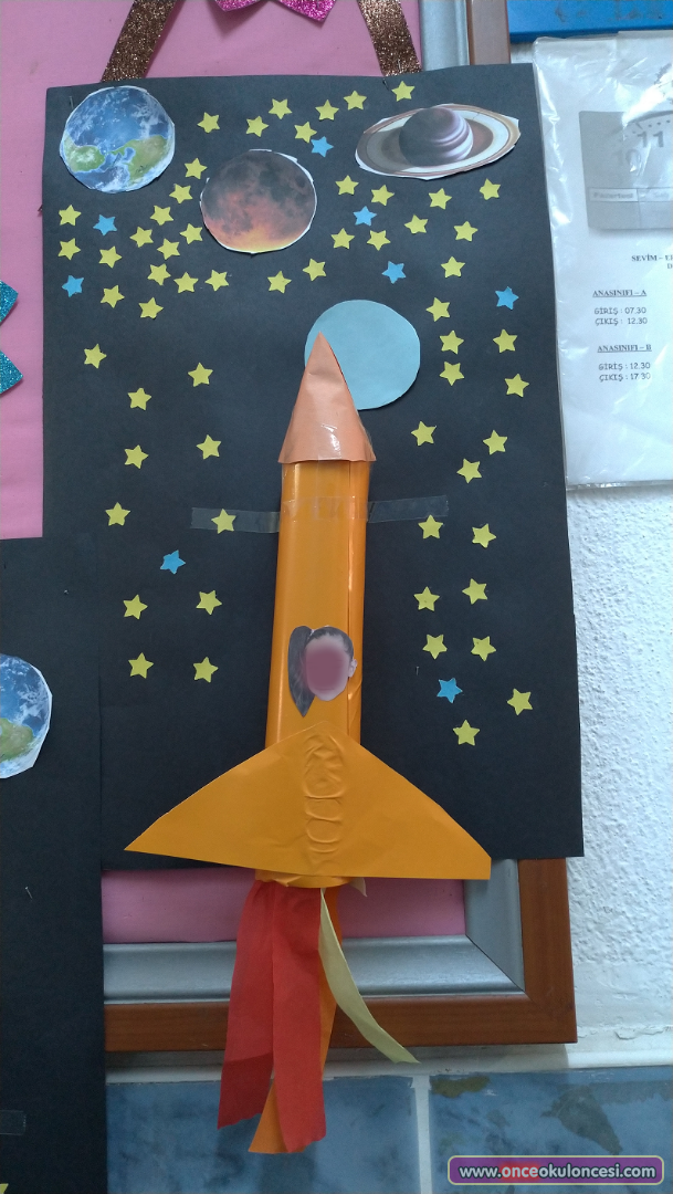 Malzemeler: 35 X 50 Siyah karton Kağıt havlu rulosu Yıldız delgeç Krepon kağıtları Renkli elişi kağıdı Renkli gezegen çıktıları İnce bant Zımba