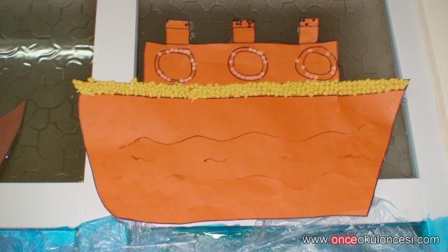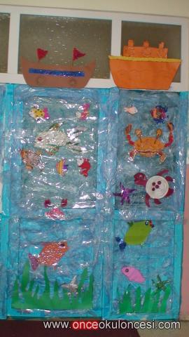 Kapının tamamı mavi jelatinle kaplandı ve üzerine mavi çöp poşetleri yapıştırıldı. Deniz canlıları da yapıştırıldıktan sonra çalışmanın sağlam kalabilmesi için şerit şerit koli bandı yapıştırıldı.
