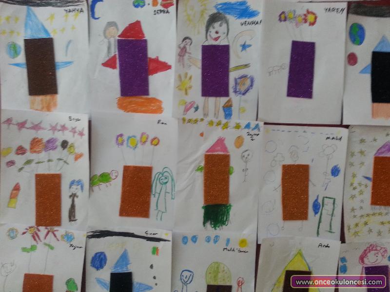 Çocuklara düzgün kesilmiş dikdörtgen şekilleri dağıtılır ve dikdörtgen şeklini kullanarak neler yapabileceklerine dair fikirleri alınır.Benimkiler roket, insan,araba,ağaç,ev,vazo yaptılar.Birbirlerinden de etkilendiler.Güzel eğlenceli bir çalışma.Tavsiye ederim.Tamamen kendi çalışmalarıdır.